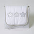 Cambiador plegable con tejido estampado y bordado en la solapa, acolchado y reverso de pvc que lo hace impermeable.