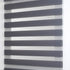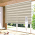 Estor enrollable doble, en tejido de franjas transparentes, cuyo movimiento vertical proporciona un decorativo y práctico juego de luz, así como el control de la visión exterior y la privacidad.