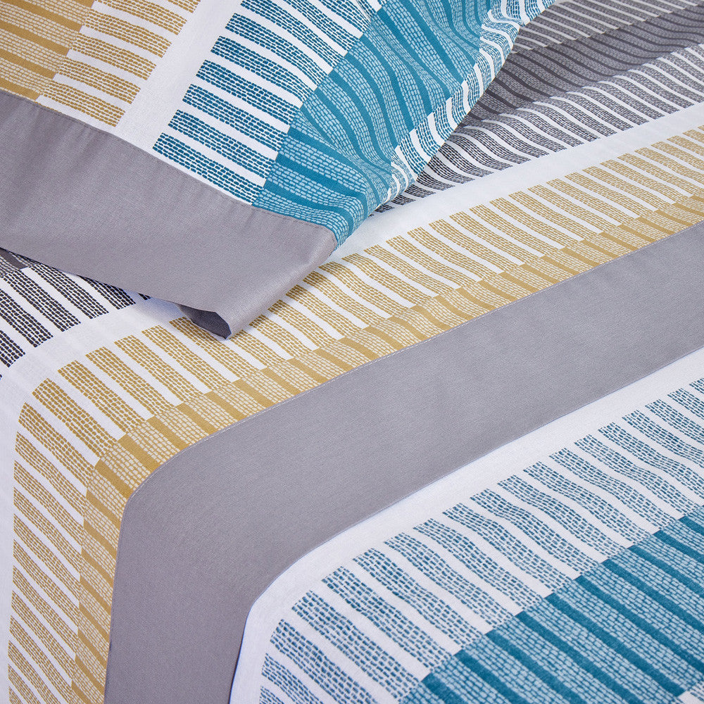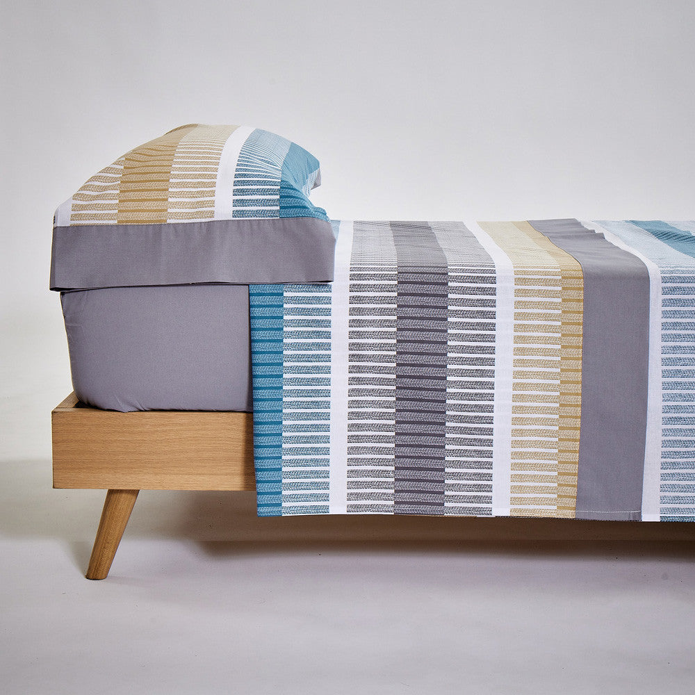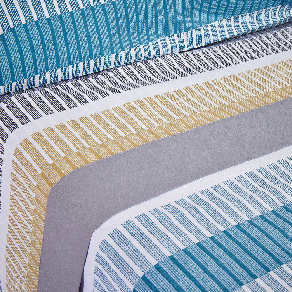El set se compone de sábana encimera estampada, bajera adaptable lisa y funda de almohada estampada con dos aperturas.