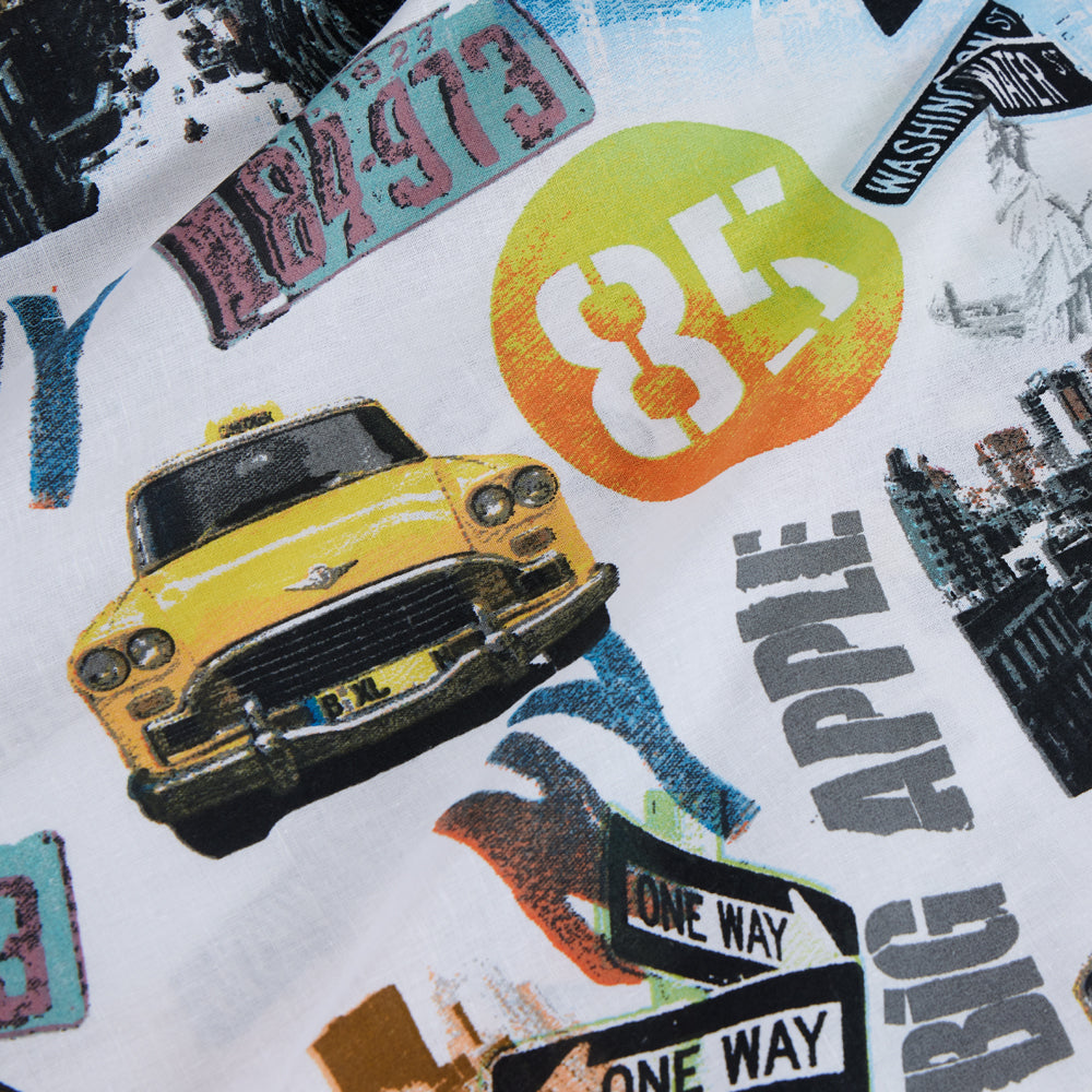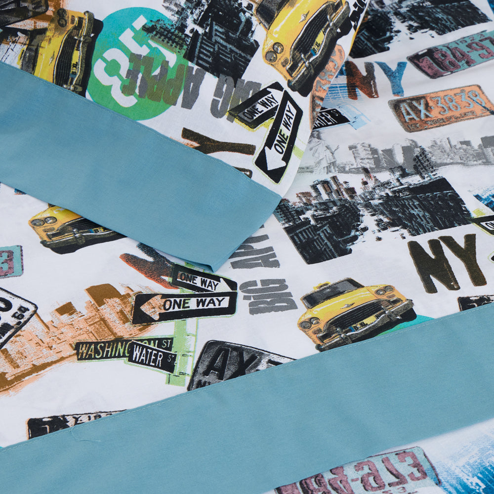 El set se compone de sábana encimera estampada, bajera adaptable lisa y funda de almohada estampada con dos aperturas.