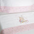 Set de tres piezas para cuna de bebé con dibujo bordado, disponible en varios colores.