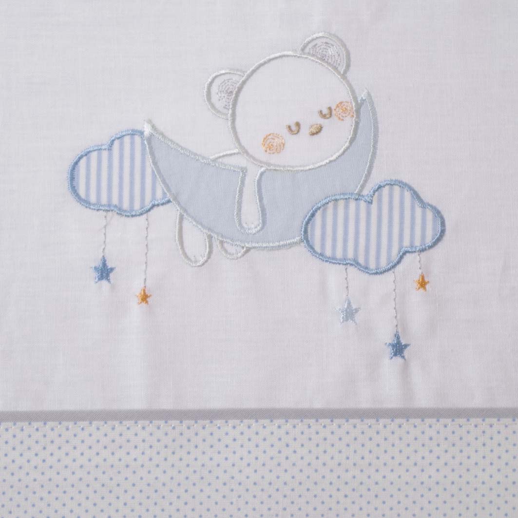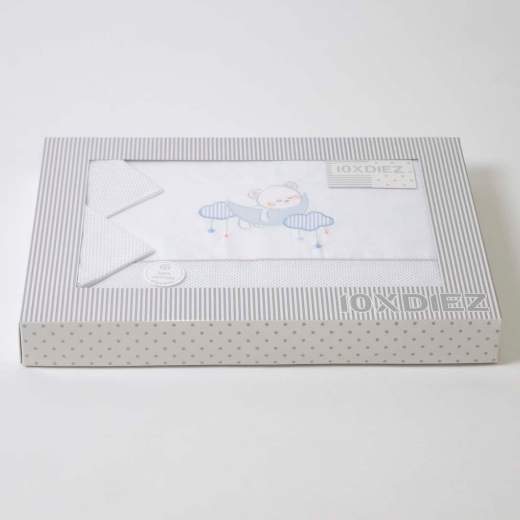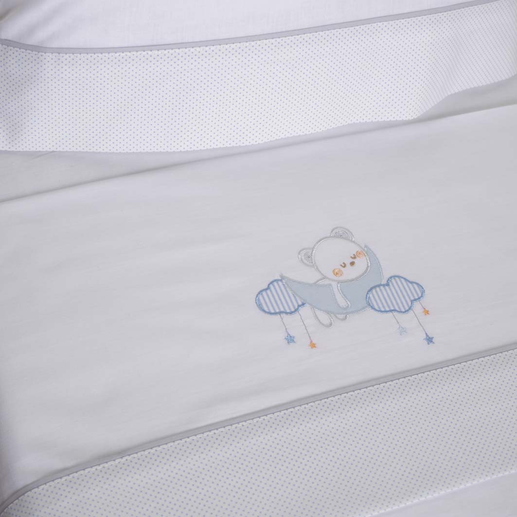 Set de tres piezas para cuna de bebé en algodón 100% con dibujo bordado, disponible en varios colores.