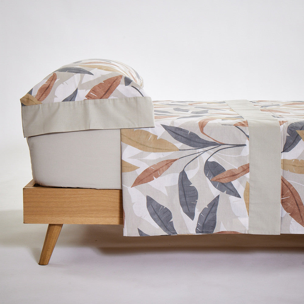 El set se compone de sábana encimera, bajera adaptable, y funda de almohada con dos aperturas.