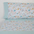 El set se compone de sábana encimera estampada, bajera adaptable lisa y funda de almohada estampada con dos aperturas.
