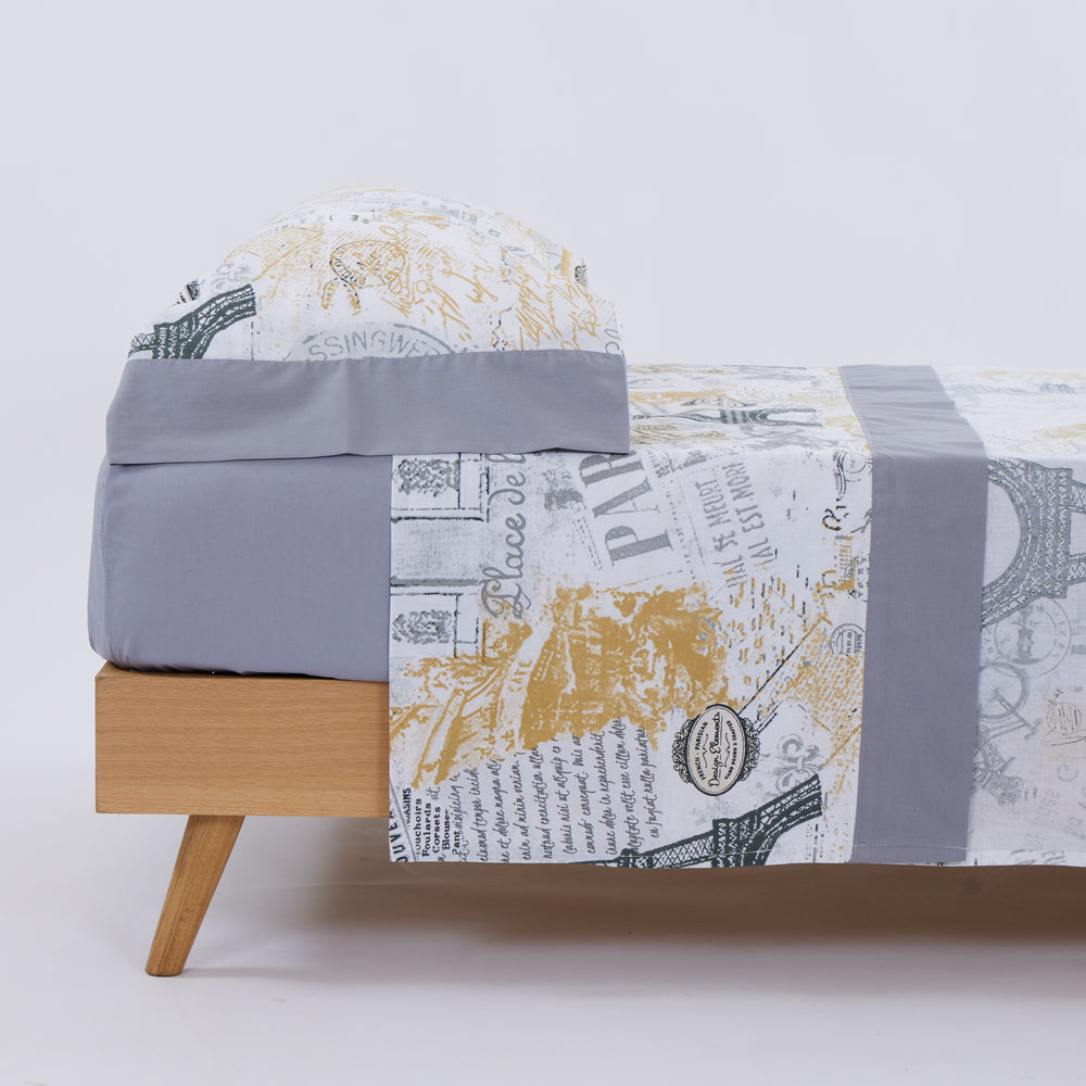 El set se compone de sábana encimera estampada, bajera adaptable lisa y funda de almohada estampada con dos aperturas.