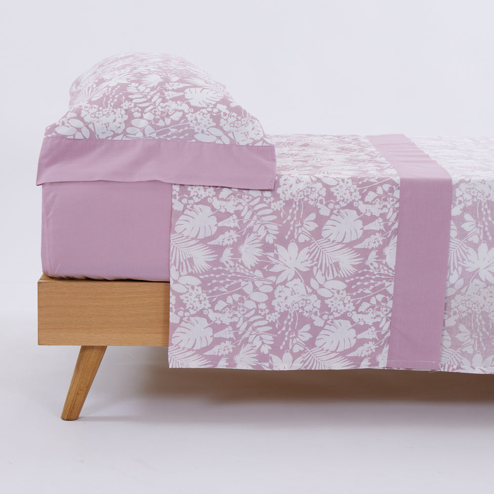 El set se compone de sábana encimera estampada, bajera adaptable lisa y funda de almohada estampada con dos aperturas.