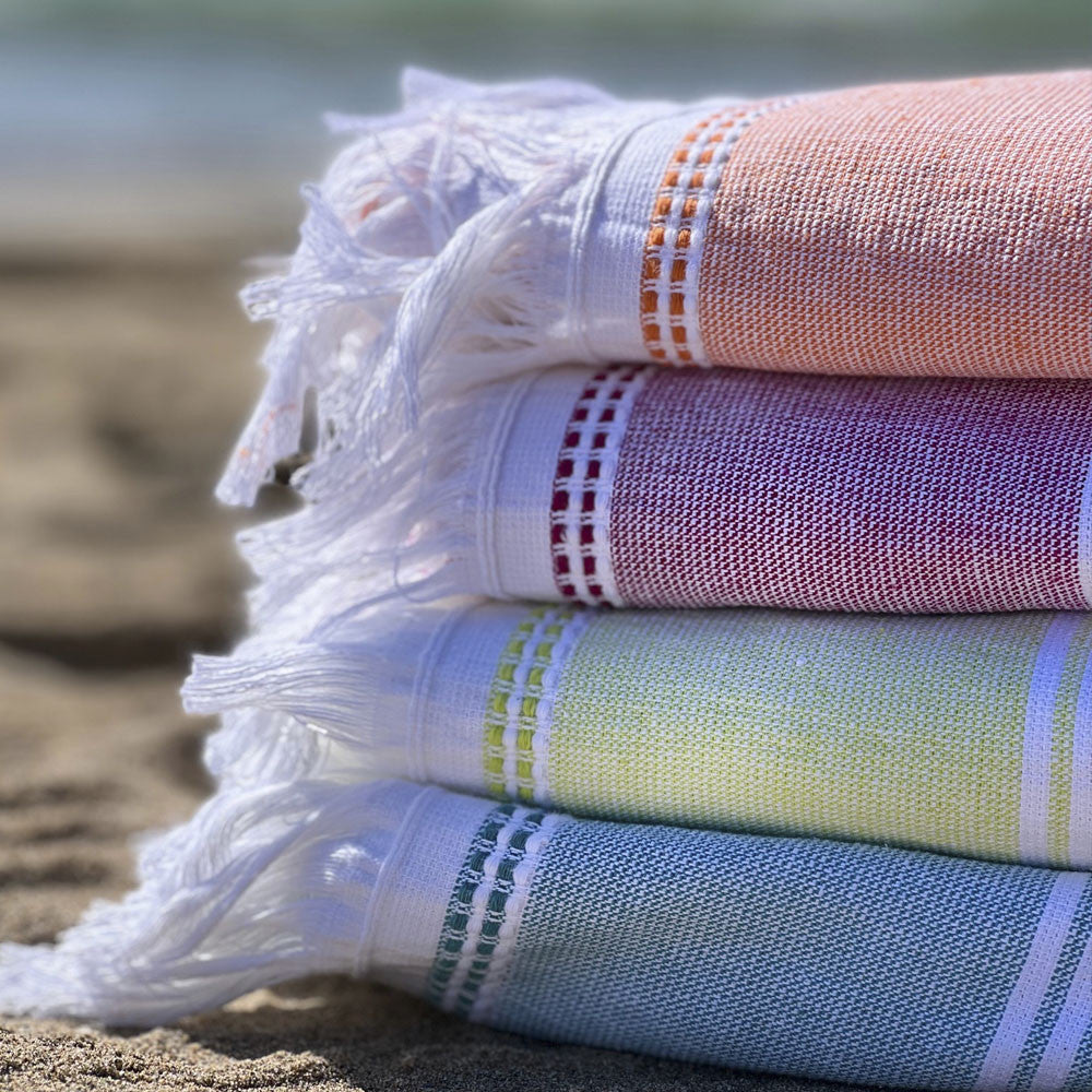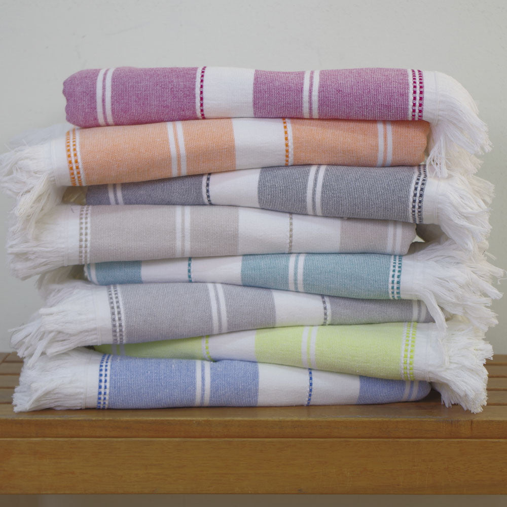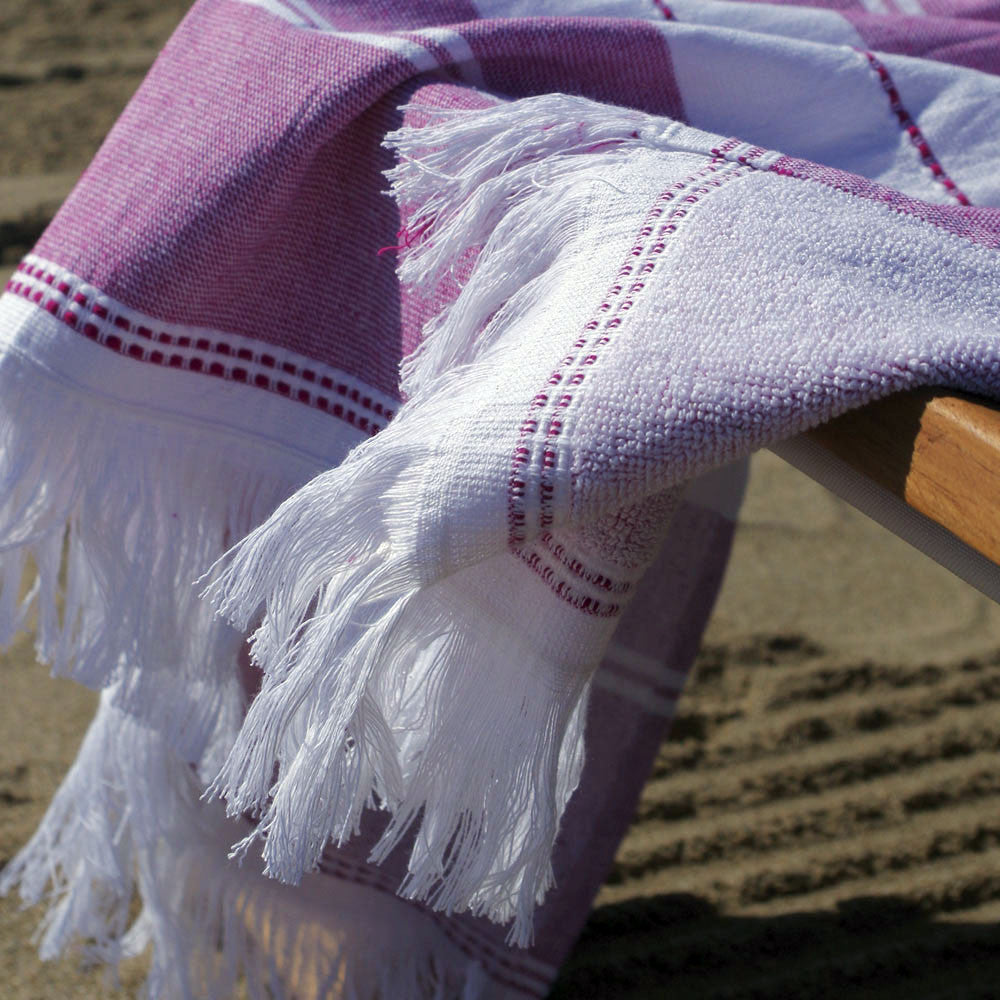 Foutah de rayas y flecos en extremos, tejido con rizo liso color blanco en el reverso.