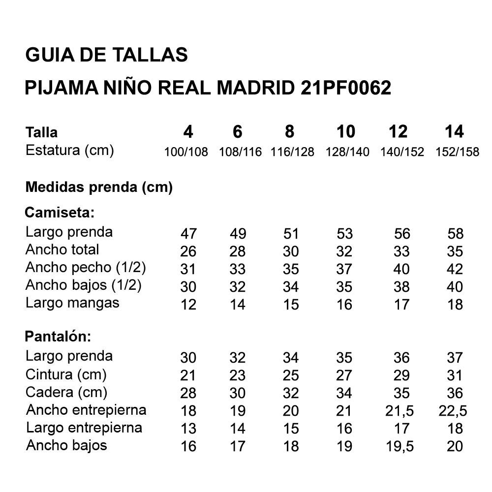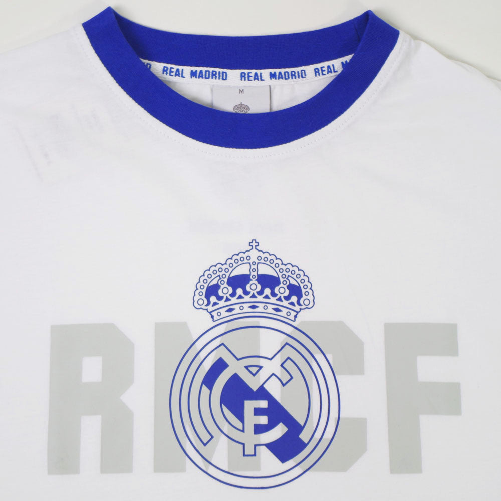 Pijama de niño del Real Madrid en punto jersey blanco y azul con el Escudo del Real Madrid estampado en el delantero y un estampado del Escudo también en el pantalón. Camiseta manga larga y pantalón largo.