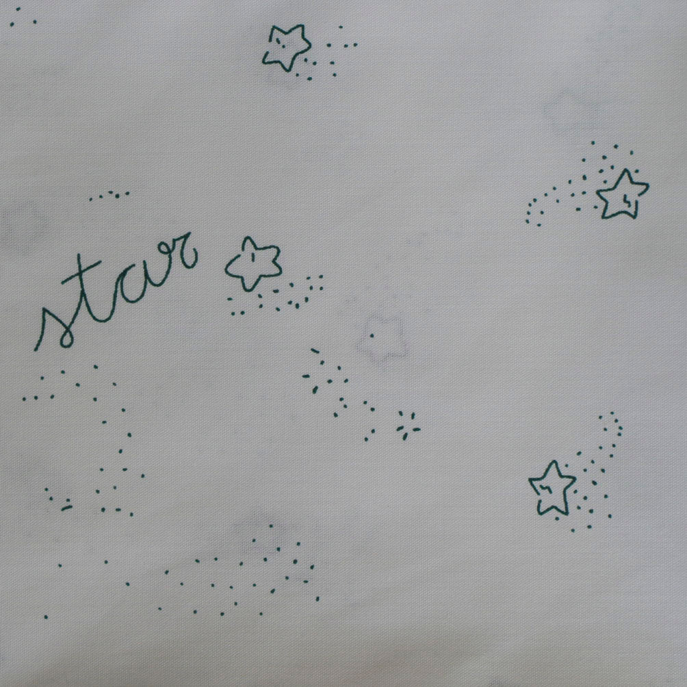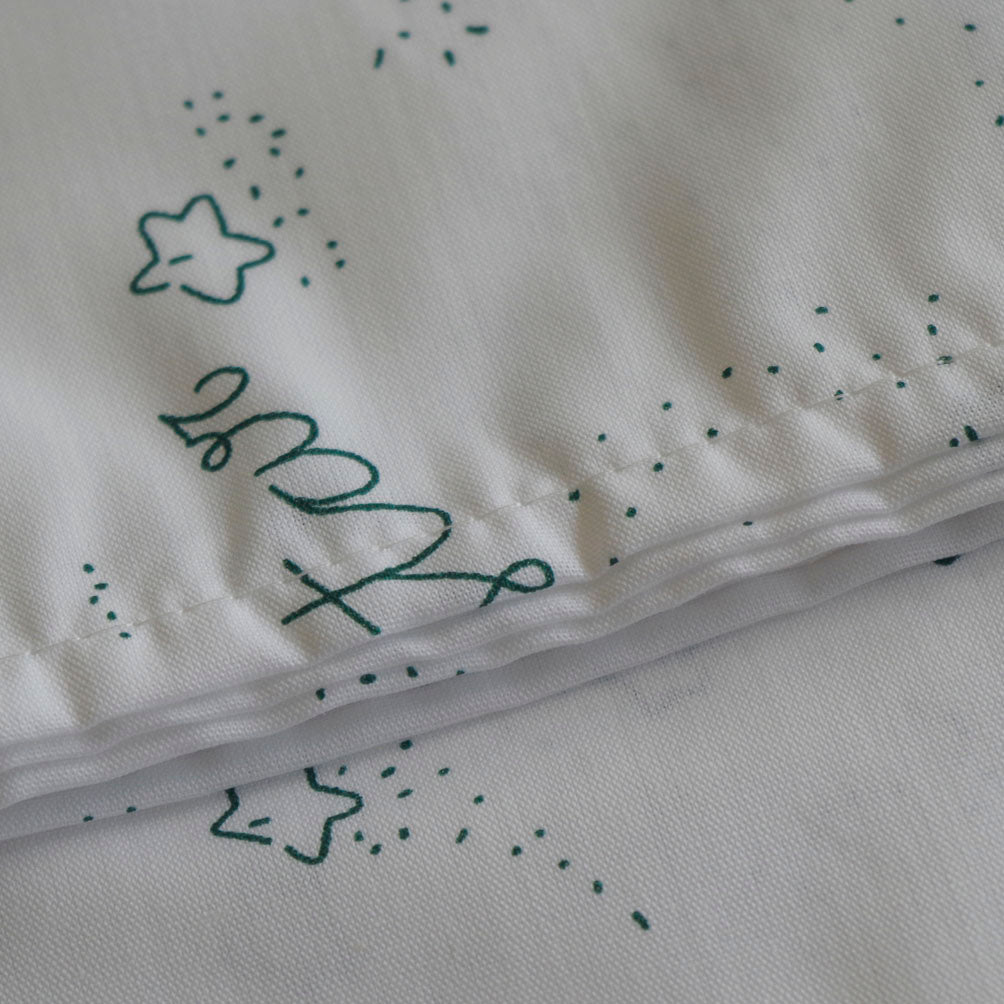 Sábana encimera para la camita de la guardería blanca con estampado de estrellitas en verde.
